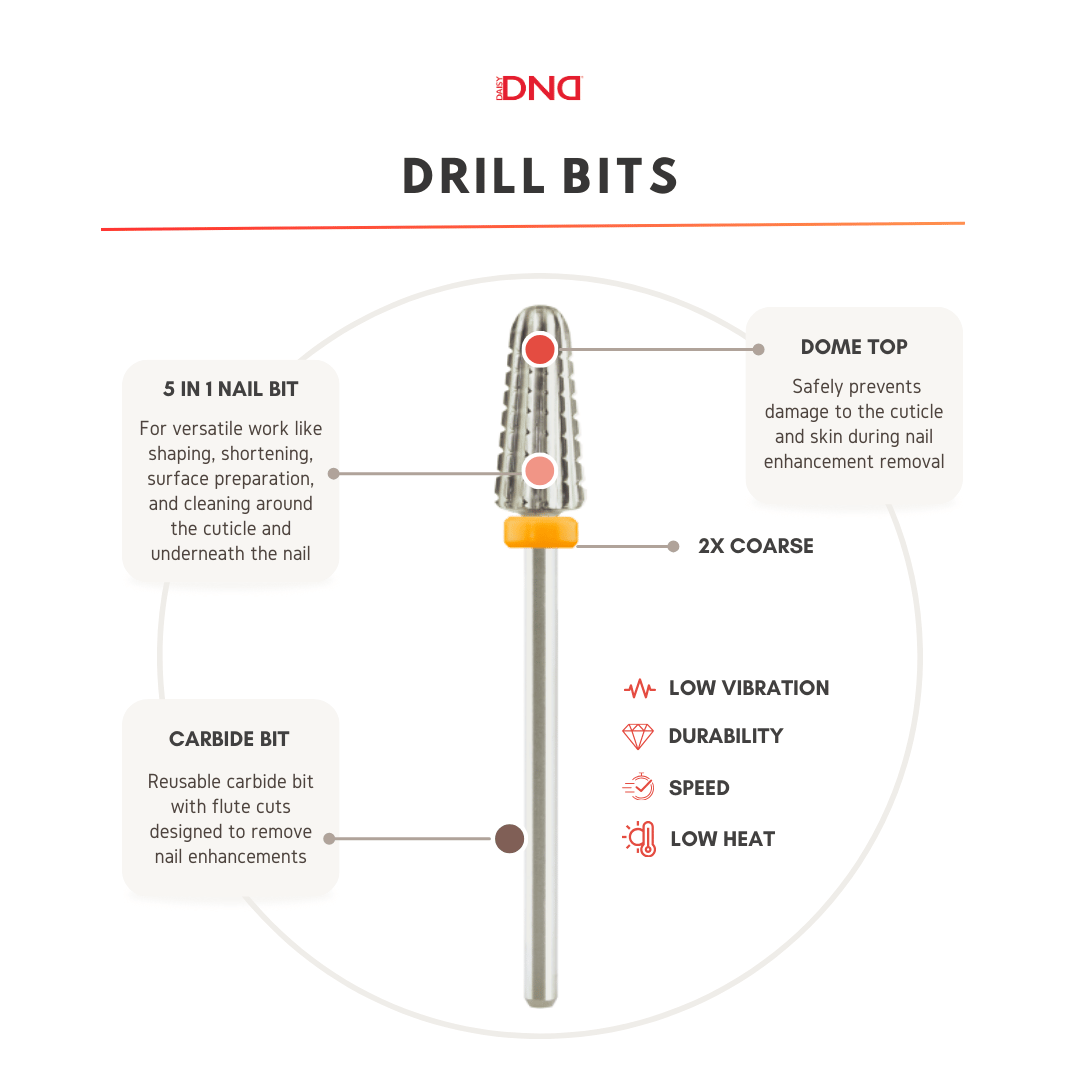 B52 (Volcano) XXC – Silver – Our carbide drill bit's conical shape with its smooth dome top is perfect for safe and detailed product removal near the sidewall, cuticle area, and under the nails. The straight flute cuts on the B52 XXC allows the user five versatile technical applications: shaping, shortening, surface preparation, and cleaning around the cuticle and underneath the nail. With its 2X coarse grit size, this bit is best used for powerfully reshaping, smoothing, shortening, or removing more robust nail enhancements like acrylic.