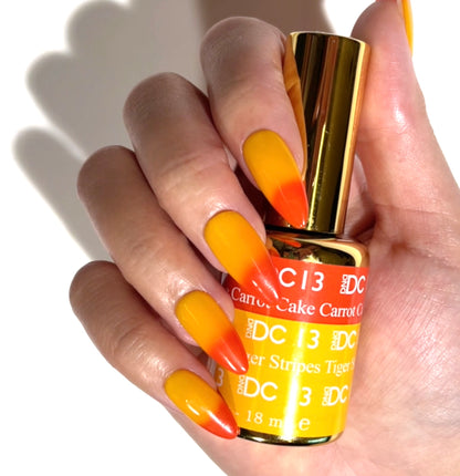 The DC Mood Change gel polishes change between 2 colors depending on the different thermal levels. For example: running your hands under warm/hot water, going outside in hot weather, or even mood changes, will cause the gel polish color to change. The colors will continue to change back and forth as your body temperature changes.