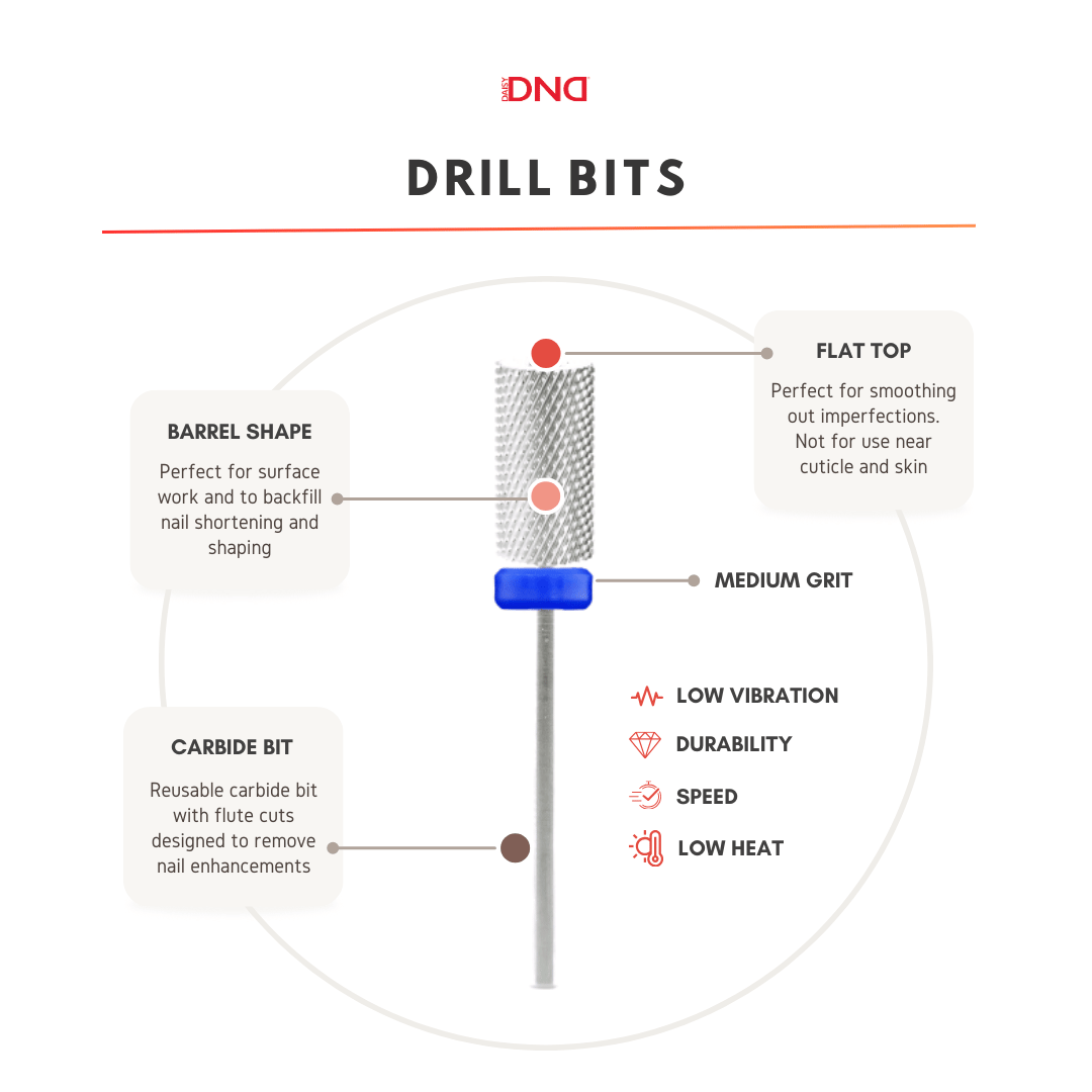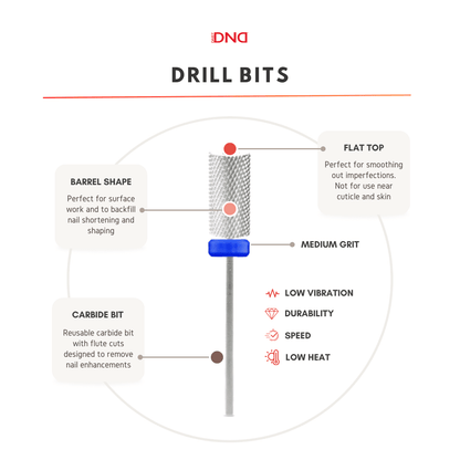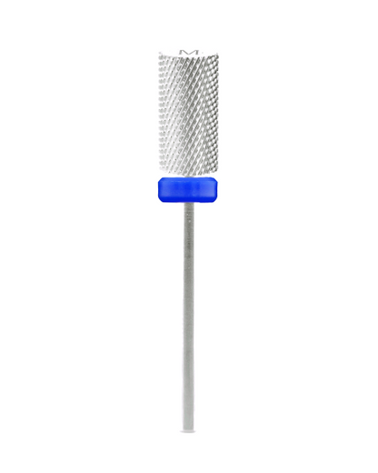 Large Barrel M – Silver – our carbide drill bit's barrel shape is perfect to backfill preparatory surface work such as nail shortening and shaping.. The medium flute cuts on the Large Barrel M allows the user to reshape and refine gel polish nail enhancements or to thin down the product layers. With a flat top, this safety bit is perfect for smoothing out imperfections but is not for use near the cuticle and skin.